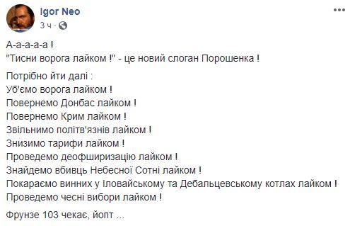 Игорь Нео предлагает президенту варианты других действий, которые можно делать при помощи лайков: "Нужно идти дальше: Убьем врага Лайком!