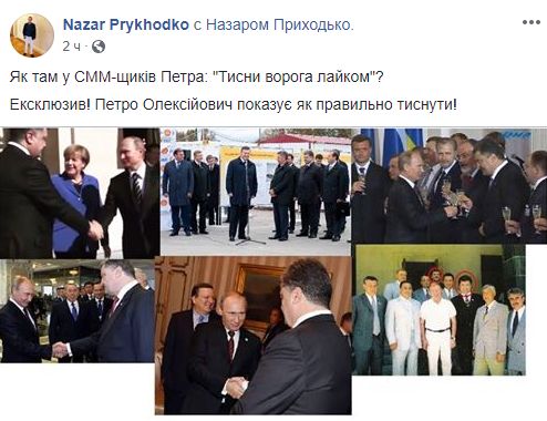 Журналист и блогер Назар Приходько опубликовал подборку фото с рукопожатиями Порошенко и Путина и подписал: "Эксклюзив! Петро Порошенко показывает, как правильно жать".