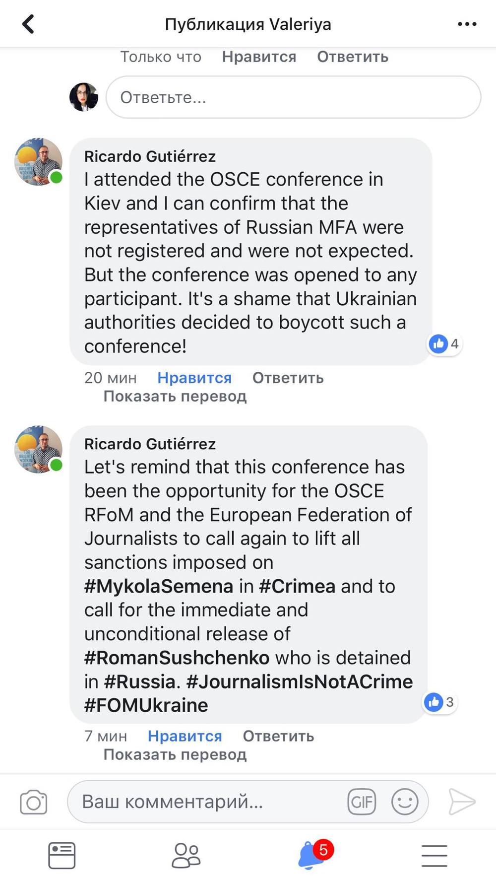 В комментариях к статусу Ивашкиной появился генсек Европейской федерации журналистов Рикардо Гутьерес. Он опроверг данные Комитета Рады о том, что российские представители были приглашены на конференцию.