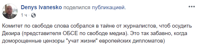 "Комитет по свободе слова собрался втайне от журналистов, чтоб осудить Дезира (представителя ОБСЕ по свободе медиа). Это так забавно, когда доморощенные цензоры "учат жизни" европейских дипломатов)", - написал он в Facebook.