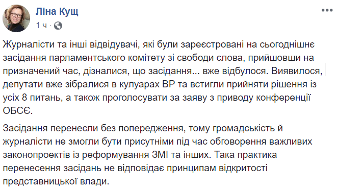 "Журналисты и другие посетители, которые были зарегистрированы на сегодняшнее заседание парламентского комитета по свободе слова, придя на назначенное время, узнали, что заседание ... уже прошло. Оказалось, депутаты уже собрались в кулуарах ВР и успели принять решение по всем 8 вопросам, а также проголосовать за заявление по поводу конференции ОБСЕ.