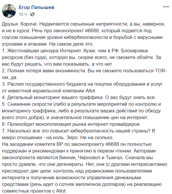 "Друзья. Короче. Надвигаются серьезные неприятности, а вы, наверное, и не в курсе. Речь про законопроект #6688, который подается под соусом повышения уровня кибербезопасности и борьбой с вирусными угрозами и атаками. На самом деле это: