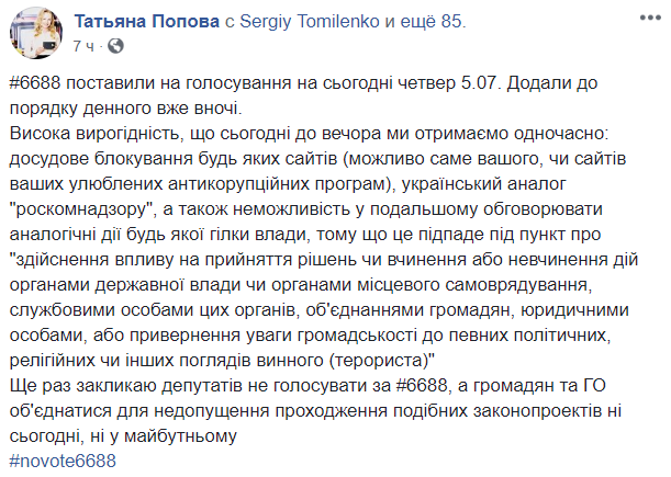 "Высокая вероятность, что сегодня к вечеру мы получим одновременно: досудебное блокирование любых сайтов (возможно именно вашего или сайтов ваших любимых антикоррупционных программ), украинский аналог "Роскомнадзора", а также невозможность в дальнейшем обсуждать аналогичные действия любой ветви власти, потому что это подпадет под пункт о "оказании воздействия на принятие решений или совершения или несовершения действий органами государственной власти или органами местного самоуправления, должностными лицами этих органов, объединениями граждан, юридическими лицами, или привлечение внимания общественности к определенным политическим, религиозным или иным взглядам виновного (террориста)", - пишет Попова.