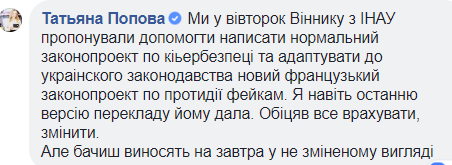 "Мы во вторник Виннику с ИнАУ (Интернет-ассоциация Украины - ред.) предлагали помочь написать нормальный законопроект по кибербезопасности и адаптировать к украинскому законодательству новый французский законопроект по противодействию фейкам. Я даже последнюю версию перевода ему дала. Обещал все учесть, изменить.