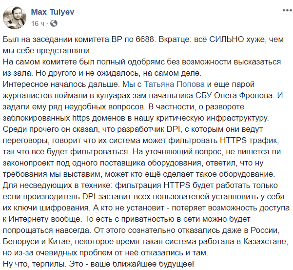 "Был на заседании комитета ВР по 6688. Вкратце: всё СИЛЬНО хуже, чем мы себе представляли. На самом комитете был полный одобрямс без возможности высказаться из зала. Но другого и не ожидалось, на самом деле".