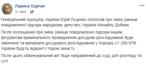 "После объявления об изменении ранее сообщенного подозрения другим фигурантам уголовного производства досудебное расследование будет закончено и материалы досудебного расследования в порядке ст. 290 УПК Украины будут открыты стороне защиты", - написала Сарган в своей странице в соцсети Фейсбук в четверг днем.