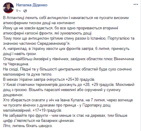 "Например, в Украине хвосты этих фронтов завтра, 6 июля, принесут дожди и даже грозы. Осадки наиболее вероятны в северных, западных областях плюс Винницкая и Черкасская. На востоке, юге и в большинстве центральных областей будет сухо солнечно ясно и очень тепло. В пределах Украины завтра ожидается + 25... + 30 градусов", - написала она.