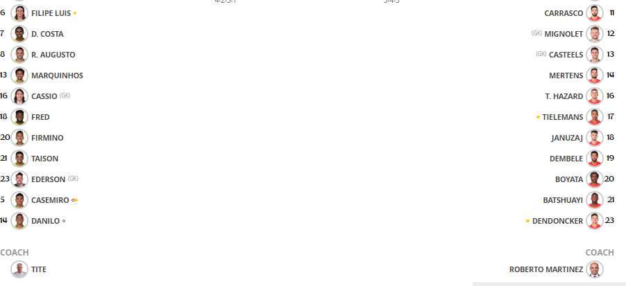 20:21 Наставник бельгийцев Роберто Мартинес внес два изменения в состав, которые многие ожидали (и надеялись). Маруан Феллайни, вероятно, использует свою физическую силу в центре (и его рост, чтобы выигрывать "воздух") на позиции Кевина де Брюйне, который теперь будет играть впереди - рядом с Иденом Азаров, за Ромелу Лукаку. Шадли занял позицию Карраско слева. С Менье справа они могут стать ключом к матчу, так как в их задачу войдет помощь трем центральным защитникам команды во время бразильских атак.