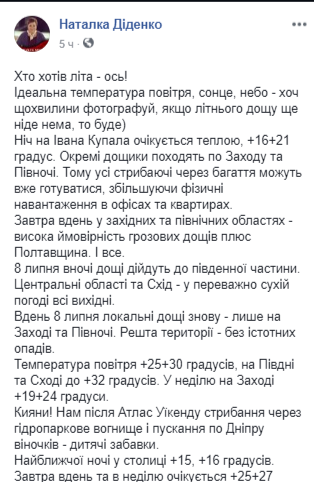 По словам Диденко, ночь на Ивана Купала ожидается теплой, +16...+21 градус. Дожди возможны на западе и севере страны, а также в Полтавской области.