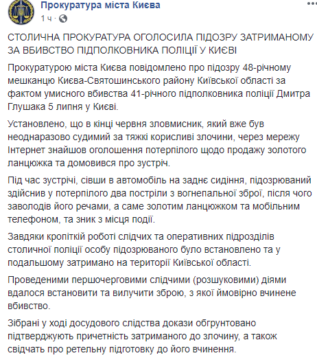 Прокуратура сообщила подозрение в умышленном убийстве подполковника полиции Дмитрия Глушака. Об этом сообщает пресс-служба столичной прокуратуры.