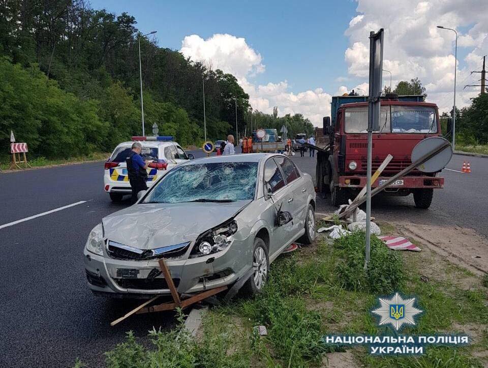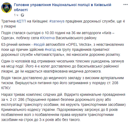 По данным полиции, 63-летний житель Киева за рулем автомобиля Opel Vectra по неустановленным причинам наехал на группу сотрудников частной дорожной службы "Автомагистраль", которые выполняли работы по нанесению дорожной разметки.