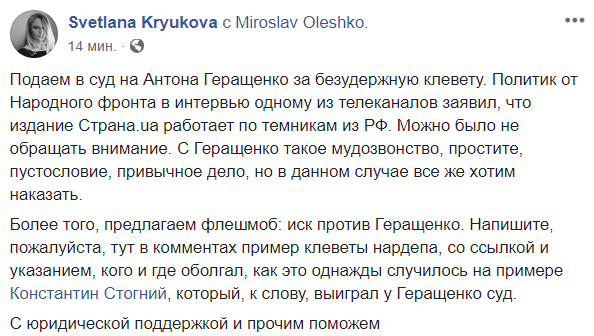 "Подаем в суд на Антона Геращенко за безудержную клевету. Политик от Народного фронта в интервью одному из телеканалов заявил, что издание Страна.ua работает по темникам из РФ. Можно было не обращать внимание. С Геращенко такое мудозвонство, простите, пустословие, привычное дело, но в данном случае все же хотим наказать.