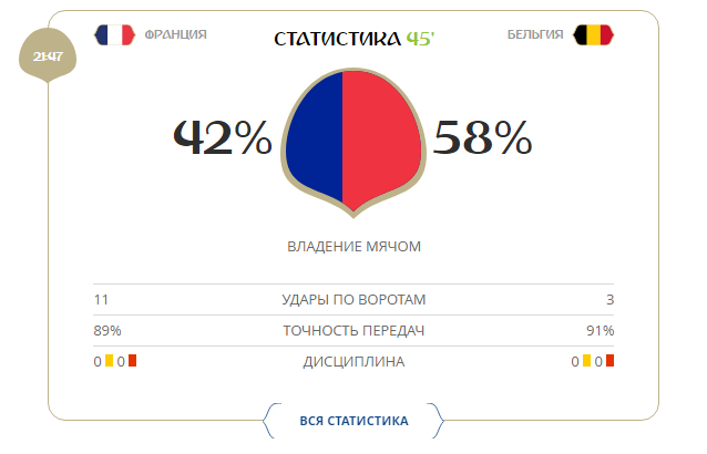 20.34 Судя по пройденному сопернику в 1/4, бельгийцы должны быть более уверены в своих силах. Они прошли Бразилию, а французы обыграли Уругвай.