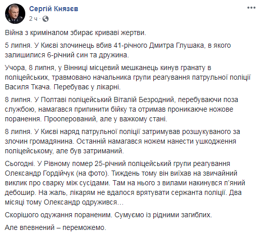 "Сегодня. В Ровно умер 25-летний полицейский группы реагирования Александр Гордейчук. Неделю назад он выехал на обычный вызов о ссоре между соседями. Там его с вилами набросился пьяный дебошир. К сожалению, врачам не удалось спасти сержанта полиции. Два месяца назад Александр женился", - написал Князев.