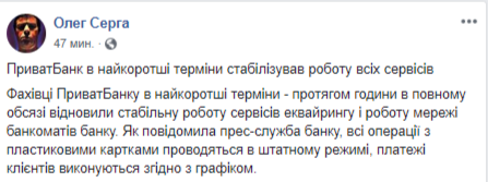 "Специалисты ПриватБанка в кратчайшие сроки - в течение часа в полном объеме восстановили стабильную работу сервисов эквайринга и работу сети банкоматов банка. Как сообщила пресс-служба банка, все операции с пластиковыми карточками проводятся в штатном режиме, платежи клиентов выполняются согласно графику", написал Олег Серга.
