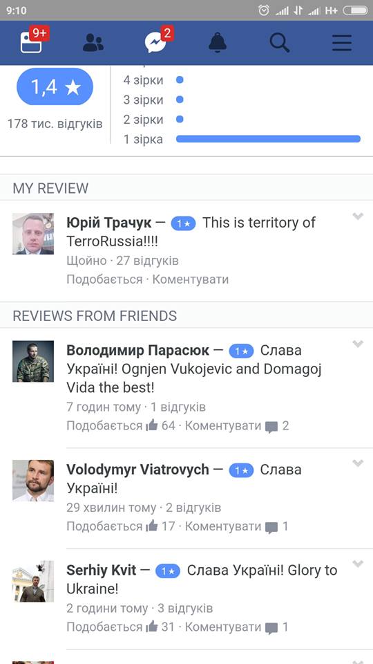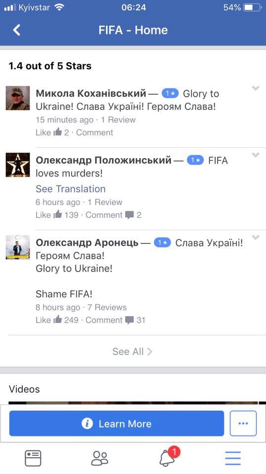 Украинцы, поддержавшие хорвата, начали заходить на Facebook-страничку Федерации и массово ставить ей отрицательный рейтинг, сопровождая это комментарием "Слава Украине!" и другими лозунгами.