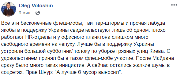 "Все эти бесконечные флеш-мобы, твиттер-штормы и прочая лабуда якобы в поддержку Украины свидетельствуют лишь об одном: плохо работают HR-отделы и у офисного планктона слишком много свободного времени на чепуху. Лучше бы в поддержку Украины устроили большой субботник/ толоку по уборке грязных улиц Киева. С удовольствием принял бы в таком флеш-мобе участие. После Майдана сразу было много таких инициатив. А сейчас остались жалкие шумы в соцсетях. Прав Шнур: "А лучше б мусор выносил"".