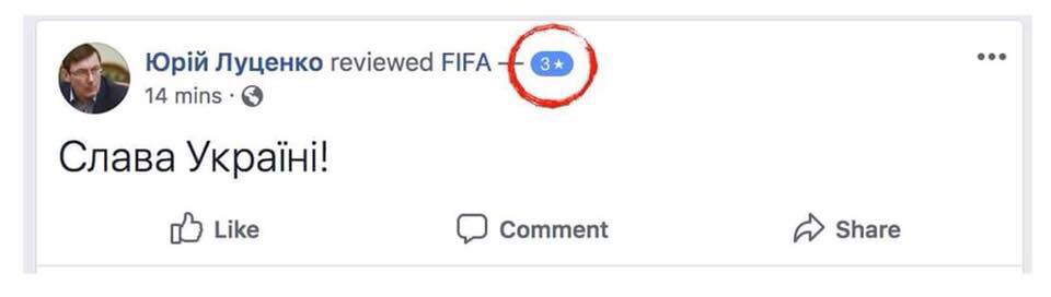 Напомним, суть флешмоба заключается в том, что люди заходят на официальную страницу FIFA в Facebook, ставят один балл в разделе отзыв, и пишут в комментариях "Слава Украине!".