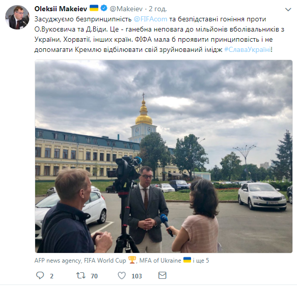 "Осуждаем беспринципность ФИФА и безосновательные гонения против Вукоевича и Виды. Это – позорное неуважение к миллионам болельщиков из Украины, Хорватии и других стран. ФИФА должна проявить принципиальность и не помогать Кремлю отбеливать свой разрушенный имидж Слава Украине!", - написал в микроблоге Твиттер политический директор МИД Украины Алексей Макеев во вторник, 10 июля.