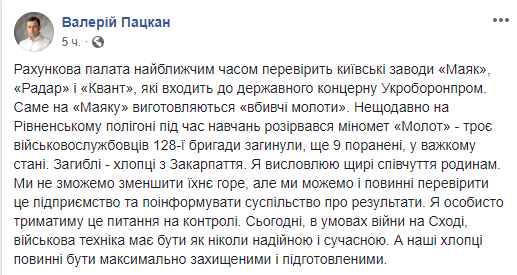 Пацкан выразил соболезнования семьям погибших военнослужащих в результате инцидента с минометом "Молот" 6 июля на 223-м общевойсковом полигоне в Ровенской области, подчеркнув: "Сегодня, в условиях войны на востоке, военная техника должна быть как никогда надежной и современной. А наши ребята должны быть максимально защищенными и подготовленными".