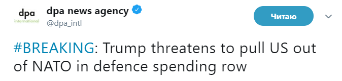 "Трамп угрожает вывести США из НАТО на фоне спора о расходах на оборону", - сообщило агентство в Twitter.