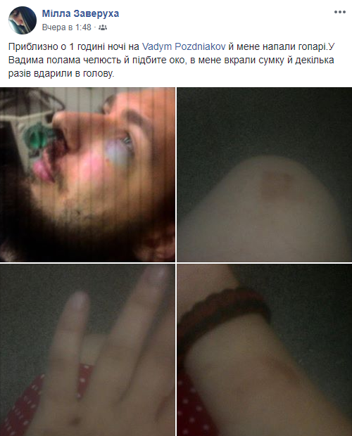 Ночью 12 июля на Салтовке неизвестные напали на лидера националистической организации "Свитанок" Вадима Позднякова и его спутницу. Инцидент произошел около часа ночи. Об этом сообщила на своей странице в Facebook Мила Заверуха.