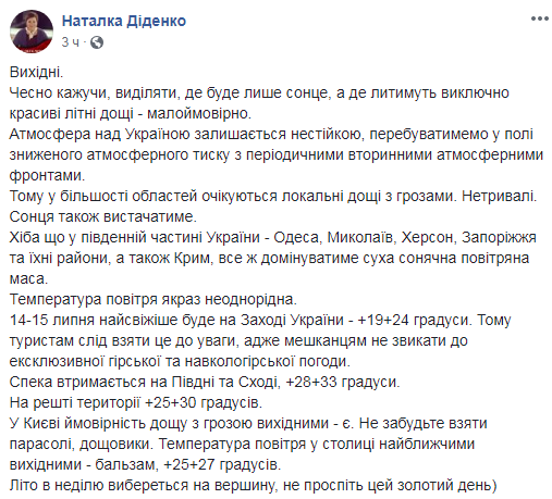Жара продержится на юге и востоке, + 28 + 33 градуса. На остальной территории + 25 + 30 градусов. В Киеве вероятность дождя с грозой выходные - есть. Не забудьте взять зонты, дождевики. Температура воздуха в столице в ближайшие выходные - бальзам, + 25 + 27 градусов. "Лето в воскресенье выберется на вершину, не проспите этот золотой день", - резюмировала Диденко.