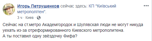 "Сейчас на ст.метро Академгородок и Шулявская люди не могут никуда уехать из-за отреформированного Киевского метрополитена.  А ты поставил одну звёздочку Фифа?" - написал возмущенный Игорь Петрушенков.