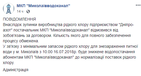 "В связи с минимальным запасом жидкого хлора для обеззараживания питьевой воды в городе Николаев с 10:00 16.07.2018 будет понижено водоснабжение абонентам ГКП "Николаевводоканал" до нормализации поставок жидкого хлора", - сказано в сообщении.