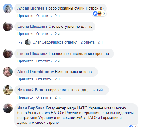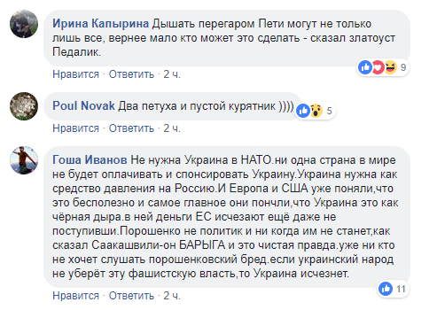 "Дышать перегаром Пети могут не только лишь все, вернее мало кто может это сделать - сказал златоуст Педалик", "Два петуха и пустой курятник", "Не нужна Украина в НАТО. Ни одна страна в мире не будет оплачивать и спонсировать Украину. Украина нужна как средство давления на Россию", - писали в сети.