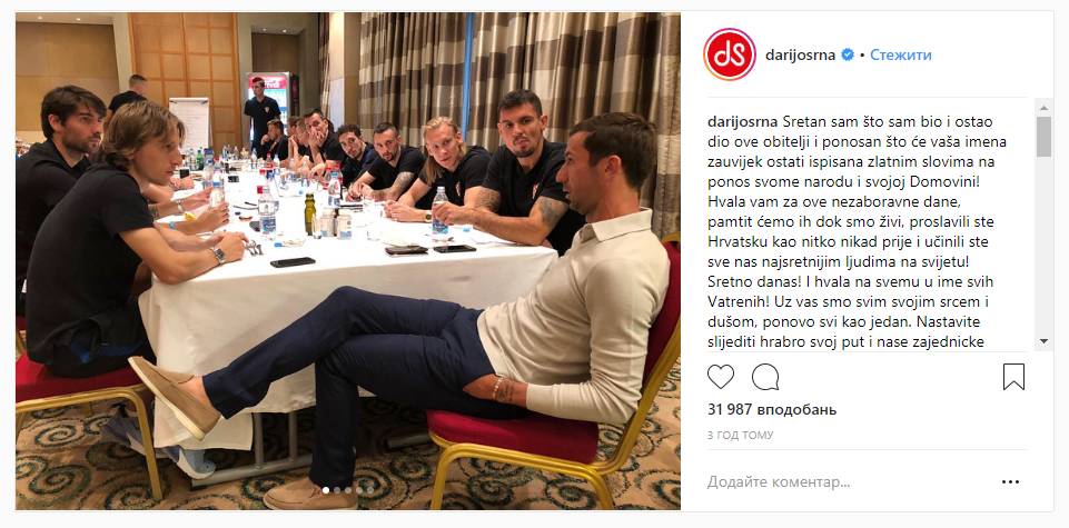 "Я рад, что был и остаюсь частью этой семьи. Я горжусь тем, что ваши имена будут вписаны золотыми буквами в историю, чтобы ваш народ и ваша родина гордились вами! Спасибо за эти незабываемые дни. Мы будем помнить их до тех пор, пока будем живы. Никто и никогда не делал хорватский народ самым счастливым в мире, а вам это удалось!", - написал он.