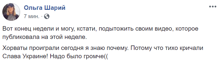 "Хорваты проиграли сегодня я знаю почему. Потому что тихо кричали Слава Украине! Надо было громче", - иронизирует журналист Ольга Шарий.