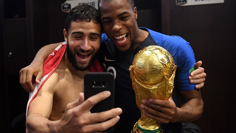 В раздевалке игроки сборной Франции фотографируются с Кубком. Телефоны будут перегружены подобными фотографиями у каждого футболиста сборной.