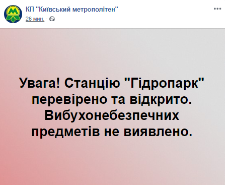 В Киеве станцию метро "Гидропарк" открыли, потратив ночь на поиски бомбы. А соседнюю "Левобережную" закрыли