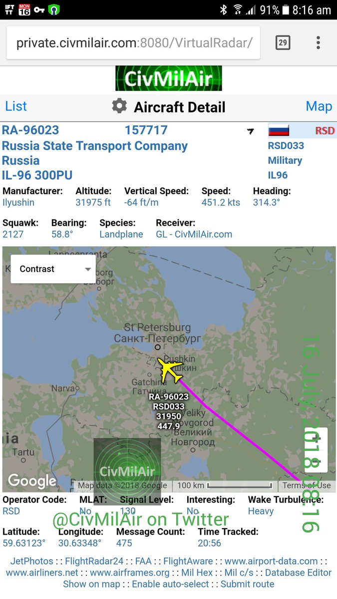 Судя по траектории полета государственный борт не может приземлиться в Санкт-Петербурге (хотя данные о полетах выглядят так), - пишет сотрудник отдела спасения Финляндии.