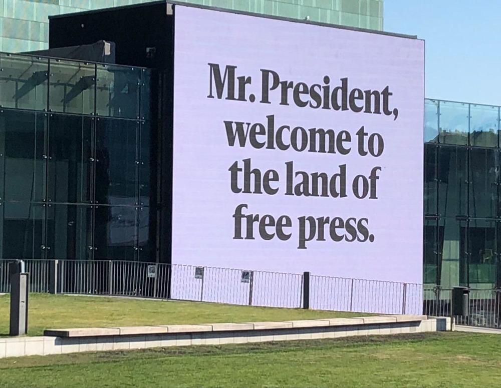 Также лично Путину на некоторых плакатах напомнили, что он приехал в свободную страну со свободной прессой.