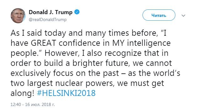 "Как я сказал сегодня и неоднократно ранее: Я абсолютно уверен в сотрудниках американских спецслужб. Однако я также осознаю, чтобы построить светлое будущее, мы не можем замыкаться исключительно на прошлом. Как две крупнейшие в мире ядерные державы мы должны наладить отношения!" - написал Трамп в своем Twitter.