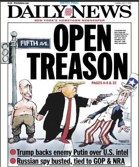 Президент США Дональд Трамп, держа за руку лидера РФ Владимира Путина, расстреливает знаменитый образ США - дядюшку Сэма. Так встречает читателя последний номер за 17 июля нью-йоркской Daily News.