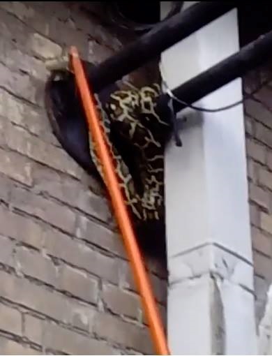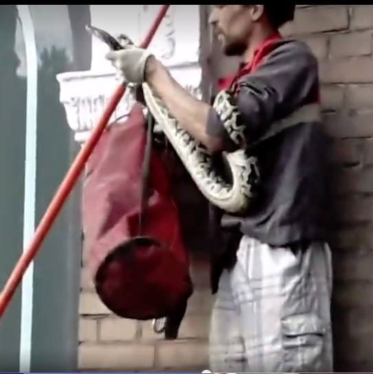 Прибывший спасатель снял тигрового питона (длиной около 2 метров) с фонаря с помощью телескопической палки.