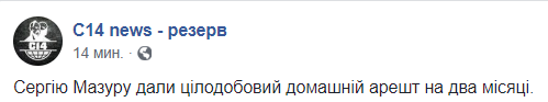 Мазуру 18 июля присудили круглосуточный домашний арест на два месяца. Об этом сообщается на Facebook С14.