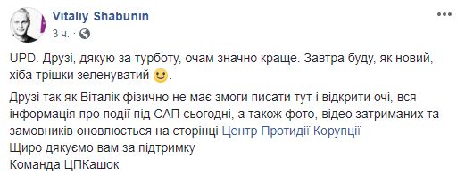 В Facebook на странице Шабунина сообщается, что сам он физически не может писать из-за ожога глаз, поэтому за него информацию пока будет обновлять пресс-центр ЦПК.