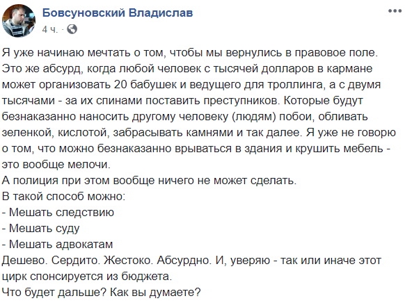 "Я уже начинаю мечтать о том, чтобы мы вернулись в правовое поле. Это же абсурд, когда любой человек с тысячей долларов в кармане может организовать 20 бабушек и ведущего для троллинга, а с двумя тысячами - за их спинами поставить преступников. Которые будут безнаказанно наносить другому человеку (людям) побои, обливать зеленкой, кислотой, забрасывать камнями и так далее. Я уже не говорю о том, что можно безнаказанно врываться в здания и крушить мебель - это вообще мелочи.