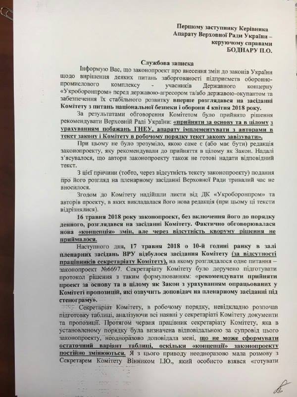 Согласно этой служебной записке, речь идет о законопроекте №6697 - о реструктуризации задолженности предприятий "Укроборонпрома" перед Россией.