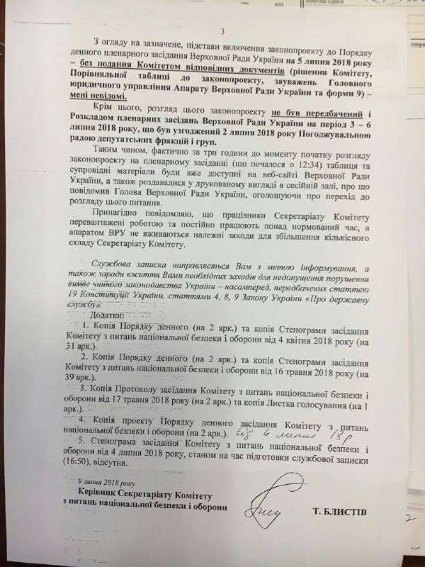 Волкова также опубликовала документ, в котором Блистив излагает суть проблемы одному из руководителей аппарата Верховной Рады.