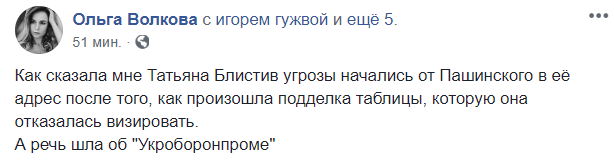 "Как сказала мне Татьяна Блистив, угрозы начались от Пашинского в её адрес после того, как произошла подделка таблицы, которую она отказалась визировать. А речь шла об "Укроборонпроме"", - заявила журналистка.