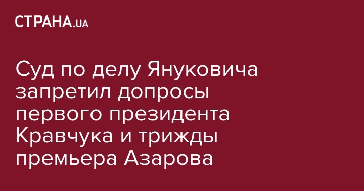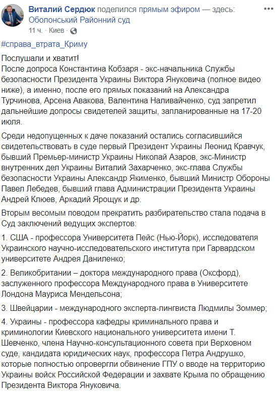 "Среди недопущенных к даче показаний остались согласившийся свидетельствовать в суде первый Президент Украины Леонид Кравчук, бывший Премьер-министр Украины Николай Азаров, экс-Министр внутренних дел Украины Виталий Захарченко, экс-глава Службы безопасности Украины Александр Якименко, бывший Министр Обороны Павел Лебедев, бывший глава Администрации Президента Украины Андрей Клюев, Аркадий Ярощук и др.", - указал Сердюк.