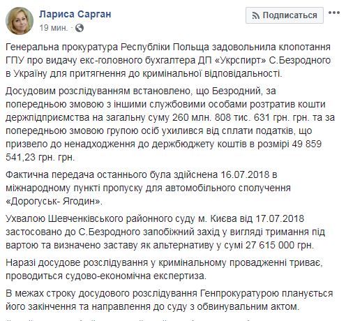 Польша экстрадировала в Украину подозреваемого в уклонении от уплаты налогов и хищении средств главного бухгалтера "Укрспирта" Сергея Безродного.