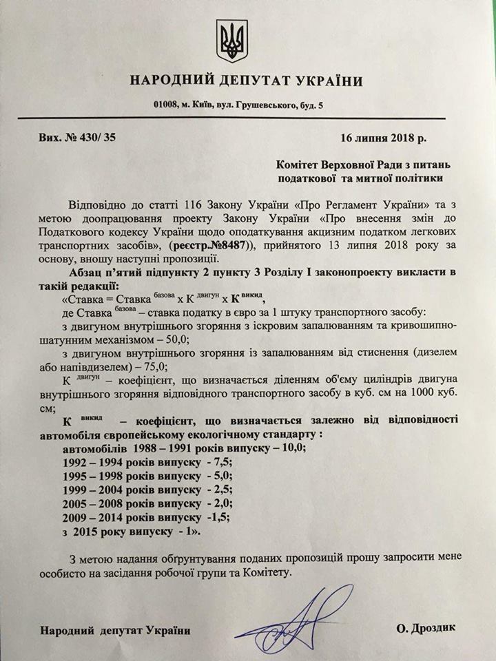 В понедельник, 16 июля, народный депутат от "Народного фронта" Александр Дроздик предложил внести правки в проект закона №8487 (О внесении изменений в Налоговый кодекс Украины относительно налогообложения акцизным налогом легковых транспортных средств), принятого 13 июля за основу. Об этом сообщает Авто Информатор.