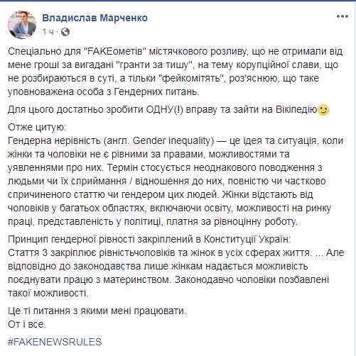 Он "специально для "FAKEометов" местечкового разлива" разъясняет, что такое уполномоченное лицо по гендерным вопросам.