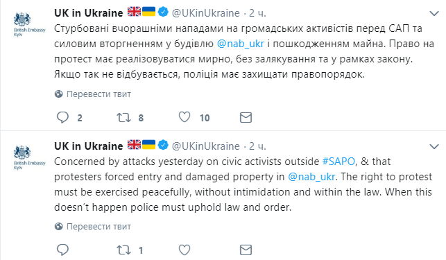 Британские дипломаты обеспокоены акциями протеста, которые вчера произошли в САП и НАБУ, дипломаты призывают мирно реализовывать право на протест в Украине. Об этом говорится в сообщении посольства в Twitter.
